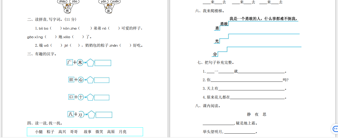 【资源名称】:一年级语文下册单元测试卷及参考答案